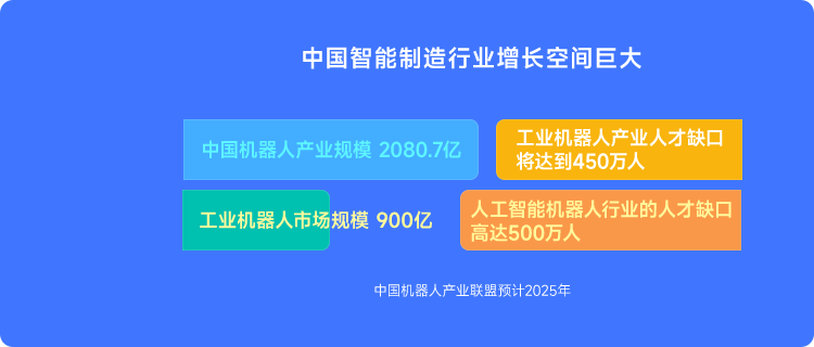 近年来,我国机器人产业进入高速发展期,成为支撑智能制造的核心产业。据中国机器人产业联盟统计,2025年中国机器人产业规模将达到2080.7亿元。中国已成为全球最大工业机器人生产及消费市场,并且2025年工业机器人市场规模有望达到 900 亿元以上。但人才短缺问题依然严重制约产业发展。预计2025年我国工业机器人产业人才缺口将达到450万人左右,人工智能机器人行业的人才缺口高达500万人。其中,复合型人才缺口率超40%,算法类岗位供需比达1:8。人才短缺已成为制约机器人产业规模化应用的关键瓶颈。